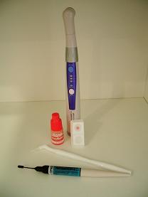 使用器材 フィッシャ-シーラントは、アクリック・レジンという樹脂にフッ素が添加された柔らかいペーストです。当院では歯への填塞が容易で、操作性に優れた白色の「ティースメイト」を使用しています。この製品は光照射で瞬時に硬化するため、お子様に長時間効果を待っていただく必要がありません。 また、填塞の前処置として、リン酸水溶液を使用した歯面のエッチングを行い、歯の溝の底を清掃します。これと同時に、歯の表面に細かい凹凸をつけてフィッシャーシーラントと歯面の接着力を高め、脱落しにくい状態に整えます。 |